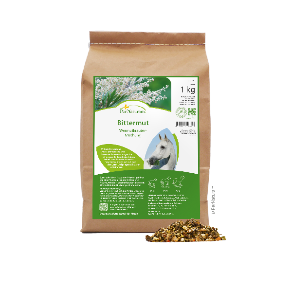 Zum natürlichen Futter von Pferden gehören von jeher Wurzeln, Kräuter, Blätter und Früchte, wie sie in der PerNaturam Bittermut Wermutkräuter-Mischung enthalten sind. Wilder Wermut (Beifuss) und andere aromatische und basenreiche Kräuter sorgen für eine gesunde Darmbesiedelung. Scharf- und Bitterstoffe sowie faserreiche Strukturen reinigen den Darm und pflegen die Darmschleimhaut.
