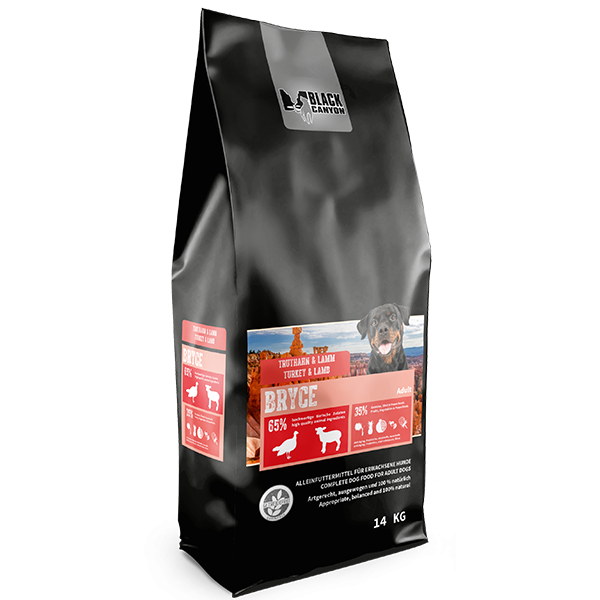 BLACK CANYON BRYCE - Truthahn & Lamm ist unsere fischfreie Rezeptur für etwas mäkelige Esser. Die besonders leckere Kombination aus Geflügel- und Lammfleisch ist leicht bekömmlich und hochverdaulich. Kleine Mengen an Kartoffeln und Erbsen liefern Ballaststoffe ohne den Darm zu belasten. Durch die Mojave-Yucca wird Blähungen vorgebeugt und Dein Hund fühlt sich nach jeder Mahlzeit pudelwohl.