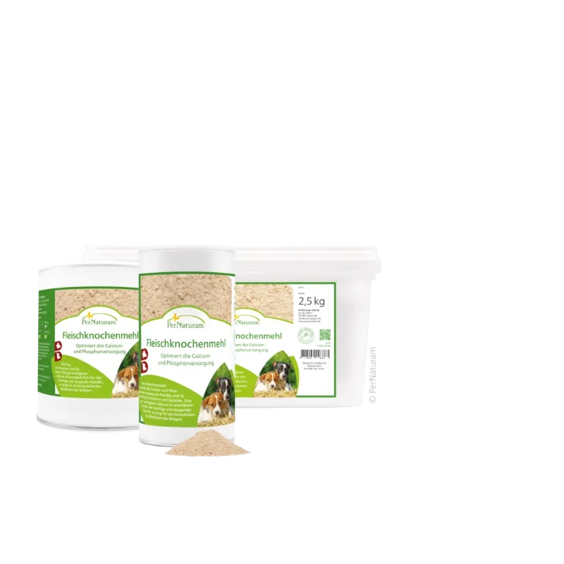 Das Fleischknochenmehl von PerNaturam wird aus genusstauglichen, fleischreichen Knochenteilen hergestellt. Durch den Fleischanteil wird eine sehr gute Akzeptanz erreicht und Verstopfung und Knochenkot werden verhindert. Das Calcium-Phosphor-Verhältnis beträgt 2,35:1.