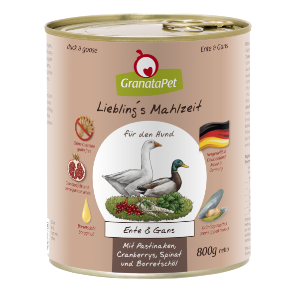 Hühner-, Enten- und Gänsefleisch 65 % (Huhn 35 % bestehend aus Muskelfleisch, Herz, Leber, Magen und Ente 15 % bestehend aus Muskelfleisch, Herz und Gans 15 % bestehend aus Muskelfleisch, Herz), Hühner-, Enten- und Gänsebrühe 24,4 %, Pastinaken 5 %, Cranberrys 2 %, Granatapfelkerne 1 % (getrocknet und fein vermahlen), Spinat 1 %, Mineralstoffe 1 %, Borretschöl 0,5 %, Grünlippmuschel 0,1 % (fein vermahlen, von Natur aus reich an Glucosamin und Chondroitin)