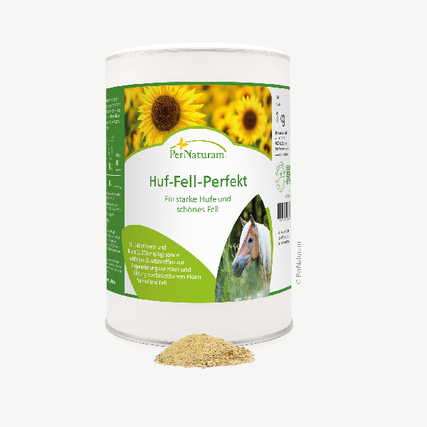 Der hohe Anteil an Biotin, kombiniert mit L-Methionin (schwefelhaltige Aminosäure) und anderen für die Hornbildung unentbehrlichen Stoffen sorgt für eine deutliche und sehr schnelle Verbesserung der Huf- und Haarbildung. Bei Hufschäden sollte Huf-Fell-Perfekt regelmäßig über lange Zeit bis zur Erneuerung gesamten Hufes gegeben werden, für den Fellwechsel wenigstens 6 Wochen lang. Eine ideale Ergänzung ist das Velvet-Öl von PerNaturam.