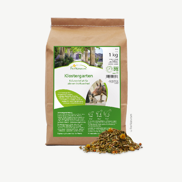 Die Klostergarten-Kräutermischung bringt die Vielfalt einer gesunden Wiese oder Weide in die Futterkrippe! Kräutervielfalt – das bedeutet zahlreiche sekundäre Pflanzenstoffe, wichtige Enzyme und viele natürliche Antioxidanzien, die wildlebende Pferde im jahreszeitlichen Wechsel permanent mit aufnehmen. Enthalten sind 28 Gewürz- und Heilkräuter, mit denen Sie das tägliche Futter bereichern.