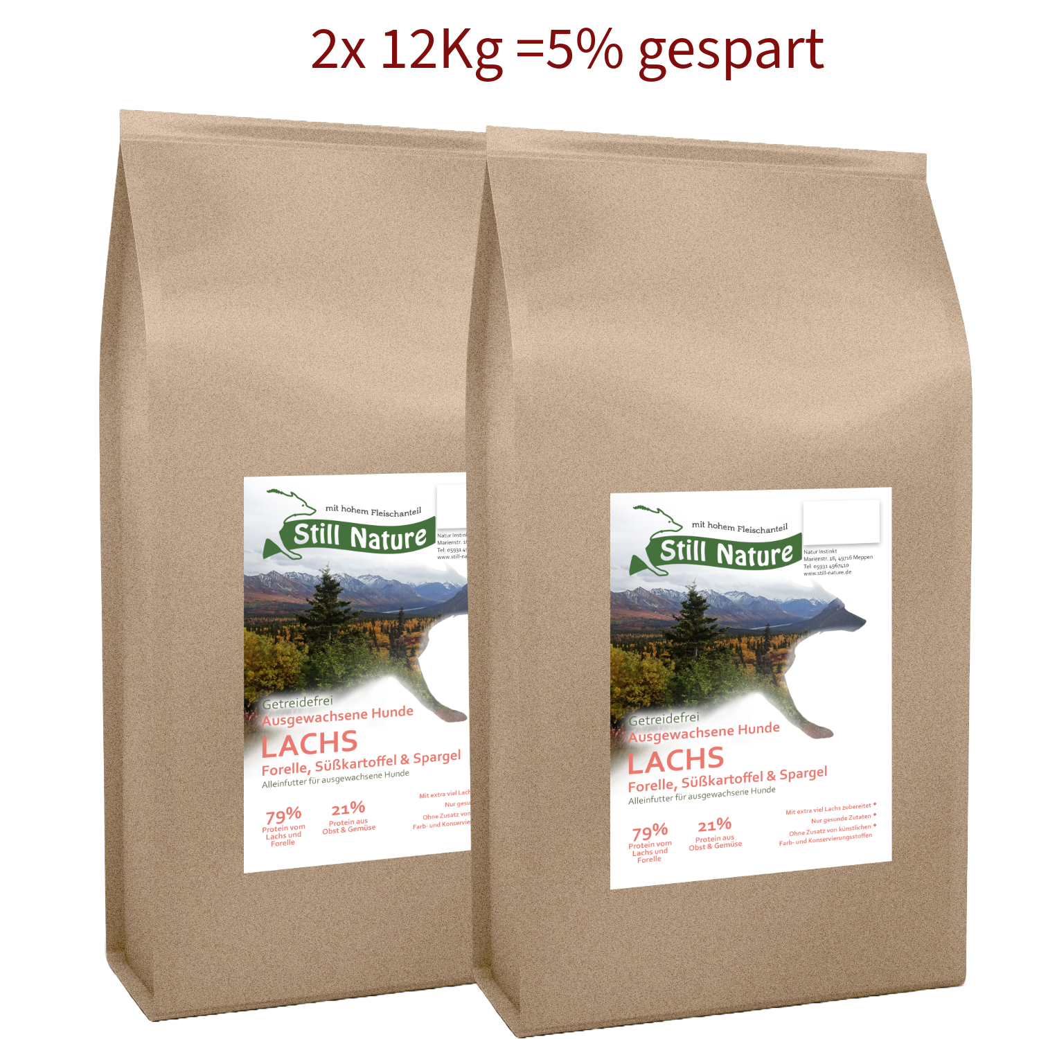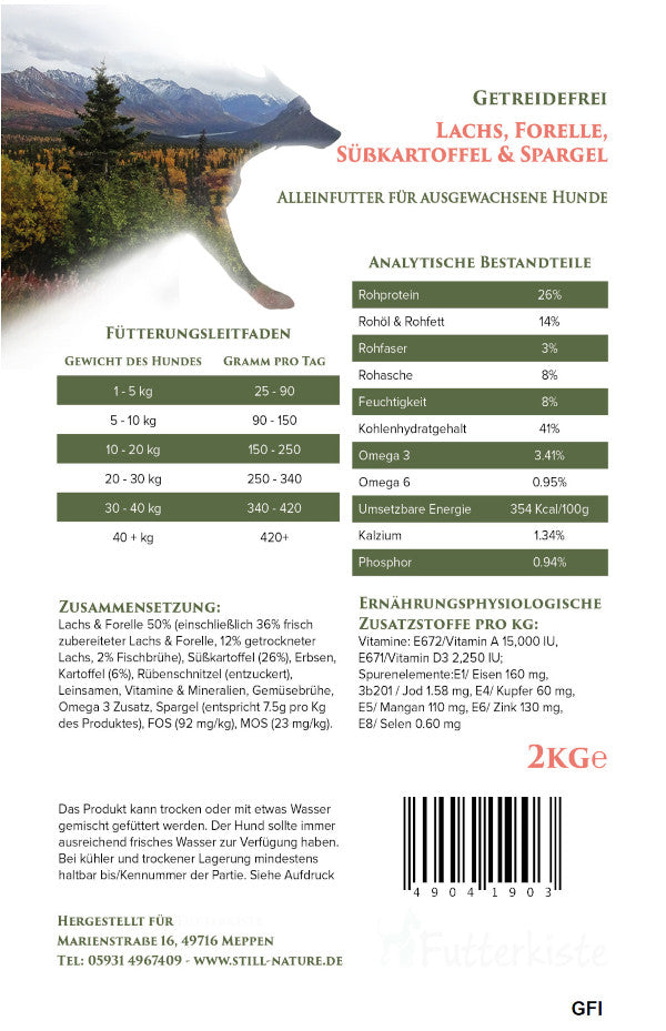 Du möchtest Deinem Hund eine besonders artgerechte und schmackhafte Ernährung bieten? Dann bist Du mit dem Lachs und Forelle mit Süßkartoffeln und Spargel Trockenfutter von Still Nature bestens bedient. Das hochwertige Futter überzeugt mit einem besonders intensiven Geschmack. Lachse werden von Wölfen im Winter den üblichen Futterquellen vorgezogen. Denn fettiger Fisch ist eine besonders gute Energiequelle und sehr reich an wertvollen Vitaminen und Omega 3. Verwöhne Deinen Hund mit einer ausgewogenen Premium-Futtermischung.