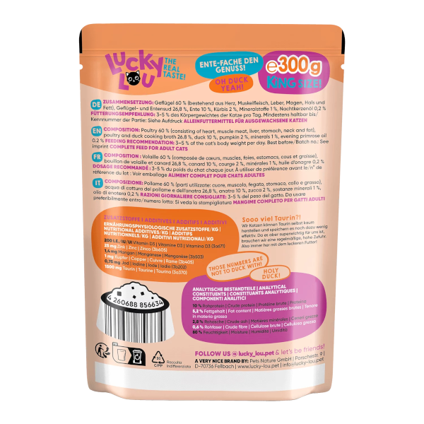 Das köstliche Katzenfutter von Lucky Lou® wurde speziell entwickelt für erwachsene Katzen, die das Beste verdienen! Unser Lifestage Adult Geflügel & Ente in der praktischen 300g XXL-Pouch bietet deiner Katze eine ausgewogene Ernährung, die sowohl lecker als auch nahrhaft ist. Die Kombination aus hochwertigem Geflügel und zartem Entenfleisch sorgt für einen intensiven Geschmack, den deine Katze lieben wird. Lucky Lou® steht für Qualität und Glück – denn glückliche Katzen sind gesunde Katzen! Mit der Lifestage-Reihe bieten wir dir eine ideale Futterlösung, die auf die Bedürfnisse erwachsener Katzen abgestimmt ist. Verwöhne deine Samtpfote mit einer Mahlzeit, die nicht nur lecker ist, sondern auch alle wichtigen Nährstoffe enthält, die sie für ein aktives und glückliches Leben benötigt