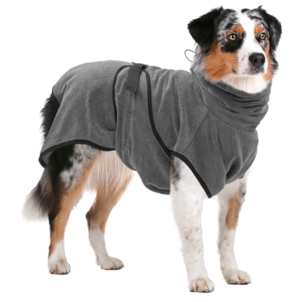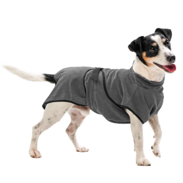 Dieser super saugfähige Bademantel aus Mikrofaser, saugt Wasser auf wie ein Schwamm. Er hält Deinen Hund herrlich warm und verhindert, dass Dein Auto, Dein Haus oder Deine Möbel nass und schmutzig werden. Dank der verschiedenen Größen, des verstellbaren Halskragens und der Klettverschlüsse findest Du für fast jeden Hund den perfekten Bademantel. Darüber hinaus ist der Bademantel für alle Fellarten geeignet. Der Royal Dry Bademantel ist extrem strapazierfähig, superweich und nimmt keine Gerüche auf. Außerdem ist der Bademantel antibakteriell und trocknet sehr schnell.